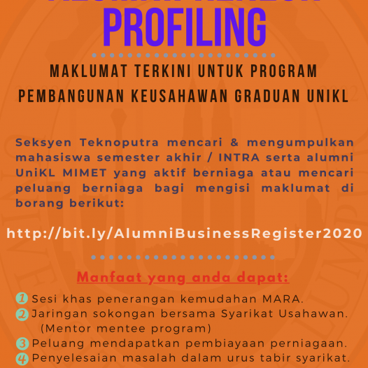 Apa itu?? ~OBJEKTIF~ Membudayakan pemikiran keusahawanan dan mewujudkan usahawanan dikalangan mahasiswa UniKL untuk membawa transformasi negara ekonomi berpendapatan tinggi di dalam mencapai status negara cemerlang. ~VISI~ Menjadi pusat pengembangan ideologi keusahawanan berasaskan ilmu pengetahuan, kemahiran dan praktikaliti perniagaan sejajar dengan kehendak semasa. ~MISI~ Untuk membudayakan pemikiran keusahawanan dan mewujudkan usahawanan dikalangan mahasiswa […]