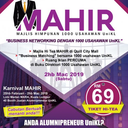 Program : Pre-MAHIR & Alumnipreneur Biz Engagement ! Tujuan program ini adalah sebagai permulaan untuk penerangan dan pengenalan mengenai MAJLIS HIMPUNAN 1000 USAHAWAN UniKL (MAHIR) yang akan diadakan pada 30/11/2019 nanti . Keduanya , program ini juga sebagai satu medium bisnes networking & engagement sesama usahawan bagi memperkenalkan dan mempromosi produk dan servis yang boleh ditawarkan kepada semua usahawan yang hadir.
